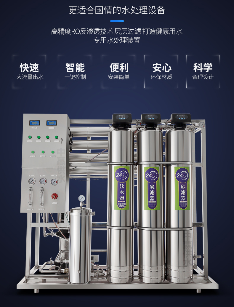 Reverse osmosis pure water equipment passes raw water through fine filters, granular activated carbon filters, compressed activated carbon filters, etc., and then pressurizes it through a pump. It uses a reverse osmosis membrane (RO membrane) with a pore size of 1/10000 μ m (equivalent to 1/6000 the size of Escherichia coli and 1/300 the size of a virus) to turn high concentration water into low concentration water. At the same time, it isolates industrial pollutants, heavy metals, bacteria, viruses, and other impurities mixed into the water, thereby achieving the physical and chemical indicators and hygiene standards specified for drinking. It is the choice for the human body to replenish water in a timely manner So people call this type of water production machine a reverse osmosis purified water machine.