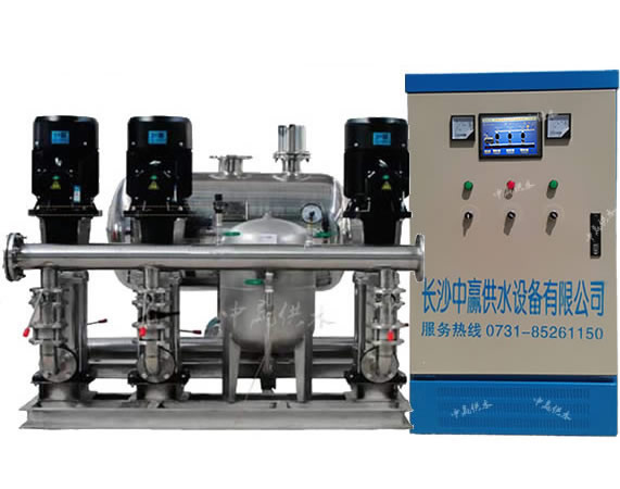 長沙中贏變頻恒壓供水設備主要由水泵機組、穩壓罐、壓力傳感器、變頻控制柜、無負壓罐、管閥附件等組成,變變頻恒壓供
