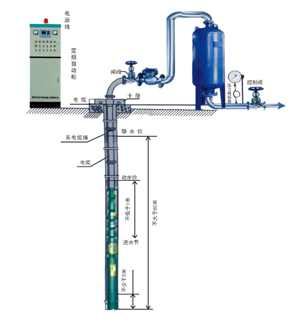 深井無塔供水設備井水加壓方案應用于廠礦、公共建設、工地施工等水源是機井的情況。深井加壓設備變頻器具有很強的保護