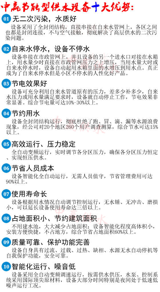 2、 充分利用了自來水管網(wǎng)原有壓力,降低了一次性投資,節(jié)電達(dá)50%-90%以上。